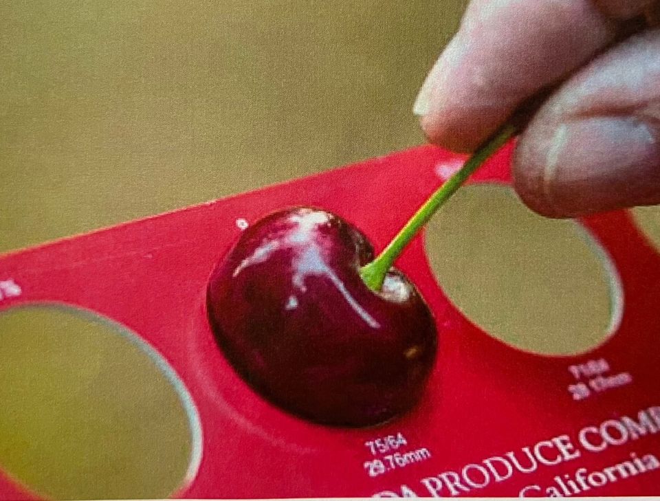 Trái Cherry Mỹ xuất khẩu được xác định kích cỡ bằng các máy quét hình ảnh tốc độ cao. Tuy nhiên, công cụ định cỡ như dưới đây vẫn được dùng để xác định kích thước “hàng” của trái cherry Mỹ. Trái sẽ được lần lượt đưa vào các lỗ từ lớn đến nhỏ cho đến khi không lọt qua được nữa. Lỗ mà nó không lọt qua chính là kích thước “hàng” - size của trái Cherry Mỹ.