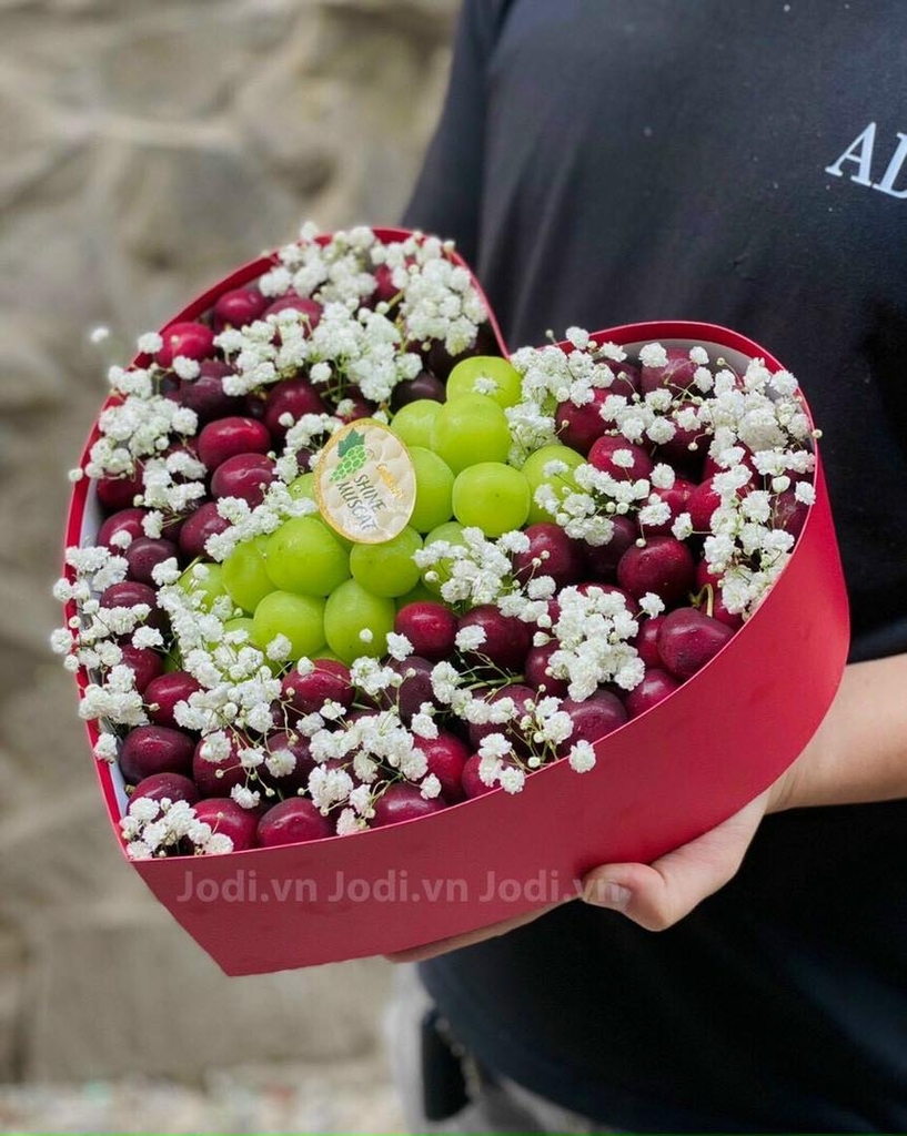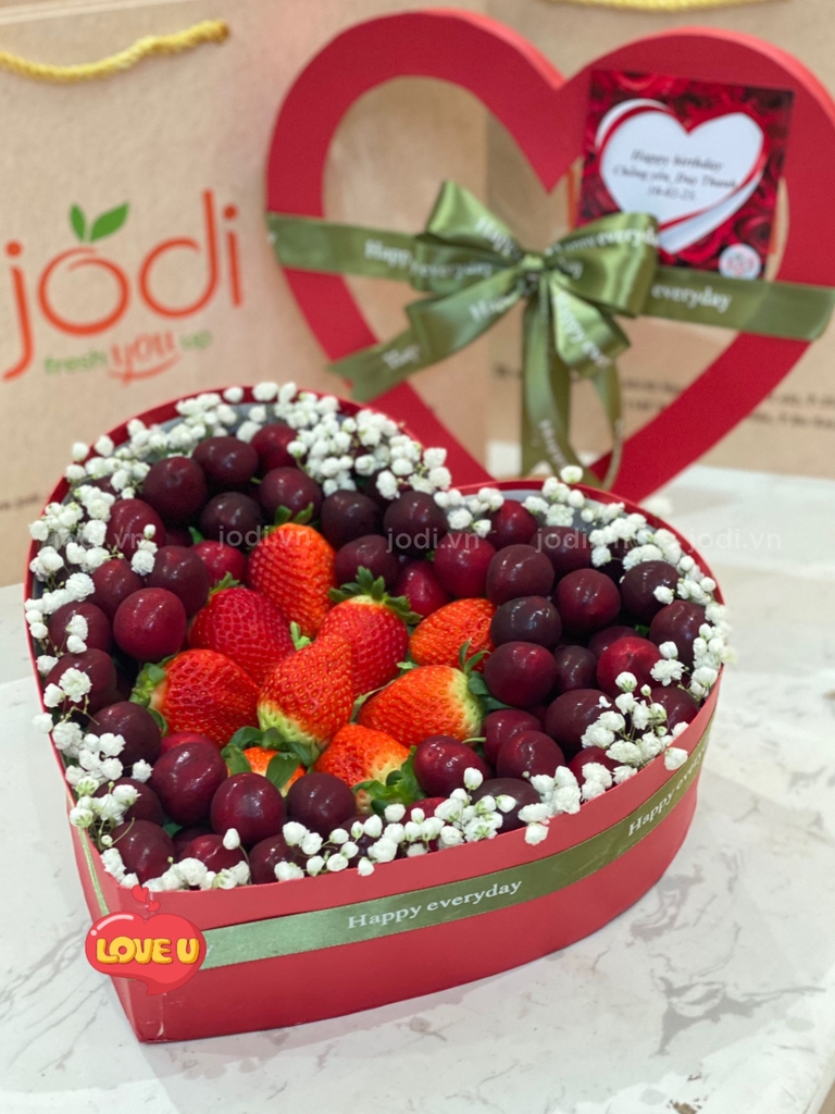 Hộp quà hình trái tim được thiết kế bắt mắt, ngọt ngào, bên trong là những quả cherry căng mọng kết hợp với các loại trái cây nhập khẩu cao cấp khác, đảm bảo sẽ khiến nàng phải ngạc nhiên và trầm trồ.